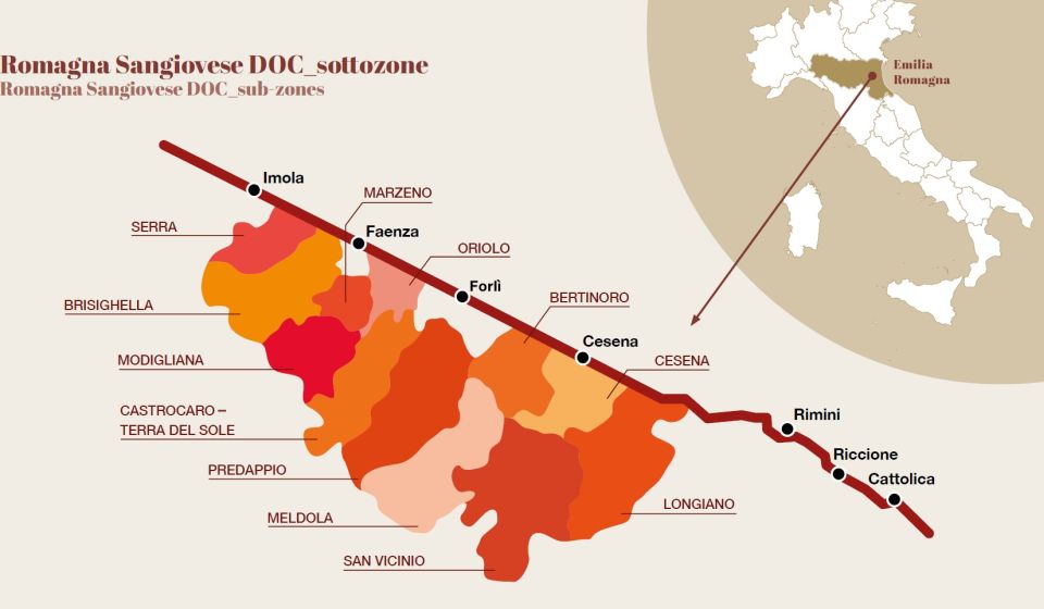 Der Weinbau in der Romagna lässt sich zurückführen auf fünf verschiedene Gebiete, von Westen nach Osten: die Gebiete Imola, Faenza, Forlì, Cesena und Rimini.