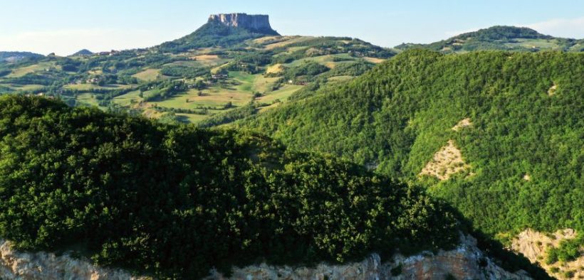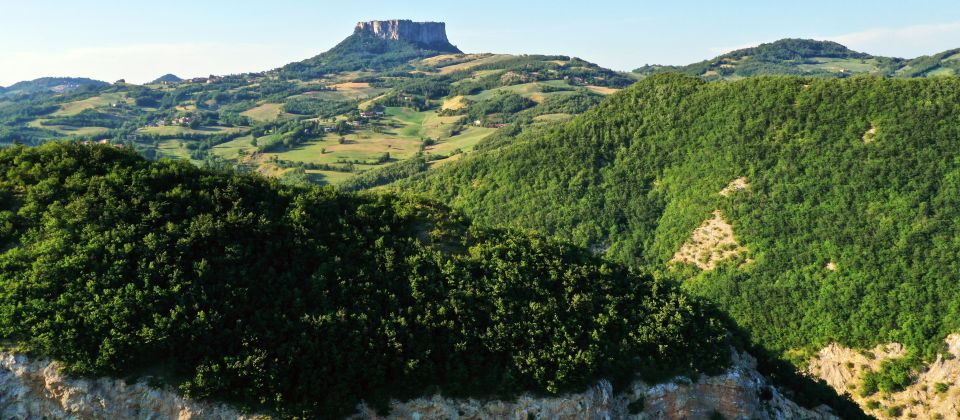 Sanfte Wiesen und Wälder breiten sich unter blauem Himmel im Herzen des Tosco-Emiliano Nationalparks aus.