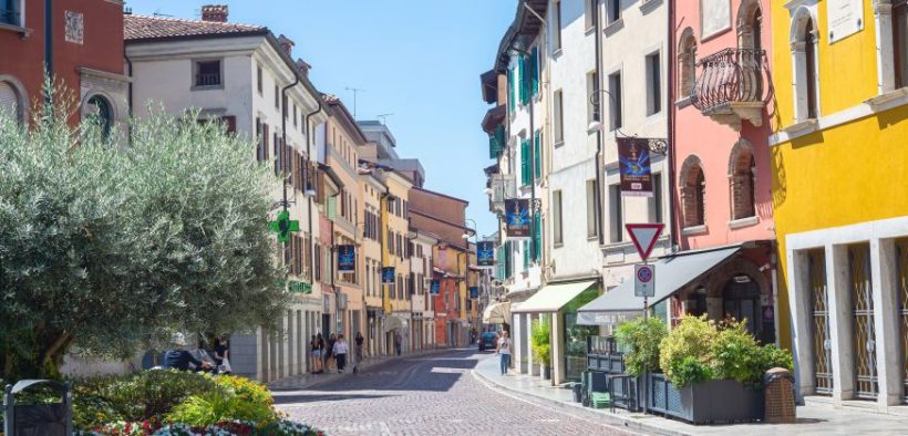 Die Via Mercatovecchio ist eine elegante Einkaufsstraße mit historischen Fassaden, Arkaden und lebendigem städtischem Flair im Herzen Udines.
