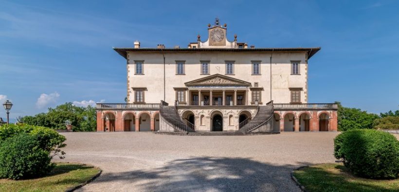 Die Villa Medicea wirkt mit ihrer breiten Treppe, den hellen Fassaden und dem weiten Vorplatz besonders majestätisch in der toskanischen Landschaft.