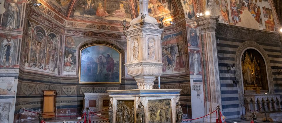 Der gesamte Innenraum des Baptisteriums zeigt, wie eng in Siena Kunst und Baukunst miteinander verschmolzen. Die Freskenzyklen, die Skulpturen und die harmonische Proportion des Raums sind sorgfältig aufeinander abgestimmt und entfalten gemeinsam eine Wirkung, die sowohl spirituell als auch künstlerisch tief berührt. Jeder Abschnitt der dekorierten Wände erzählt eine eigene Geschichte, die sich mit dem religiösen Zweck des Ortes verbindet und den Betrachter in eine Welt mittelalterlicher Frömmigkeit eintauchen lässt.