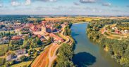 Die sechseckigen Türme heben sich markant von der Umgebung ab.