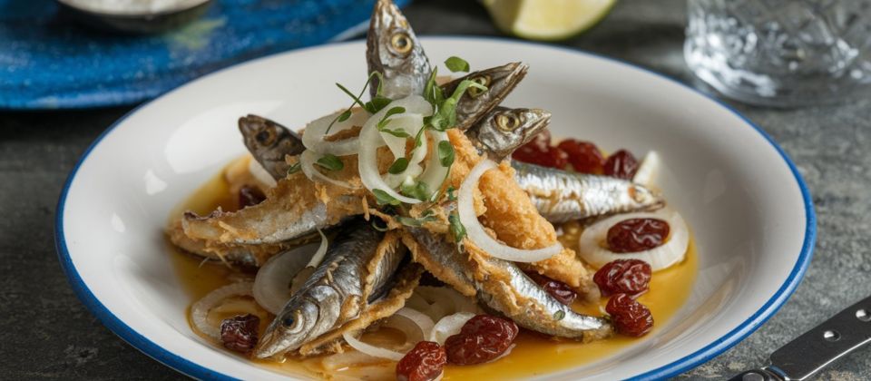 Die Basis bilden frische Sardinen, die zunächst ausgenommen, entgrätet und leicht bemehlt in Olivenöl knusprig goldbraun gebraten werden. Anschließend werden sie in eine Marinade aus Zwiebeln, Essig, Rosinen und Pinienkernen geschichtet. Diese Mischung verleiht dem Gericht eine perfekte Balance aus Süße und Säure, Weichheit und Würze. Die Zwiebeln werden langsam geschmort, bis sie zart und goldgelb sind, dann mit Weißweinessig abgelöscht und mit den übrigen Zutaten vermengt. In dieser Marinade ruht der Fisch mindestens 24 Stunden – je länger, desto intensiver der Geschmack.