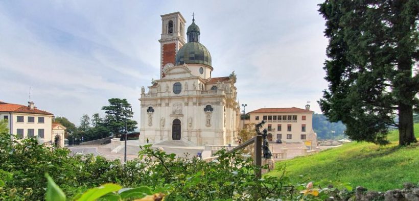Das Santuario della Madonna di Monte Berico thront auf einem Hügel über Vicenza mit weitem Blick auf Stadt und Ebene.